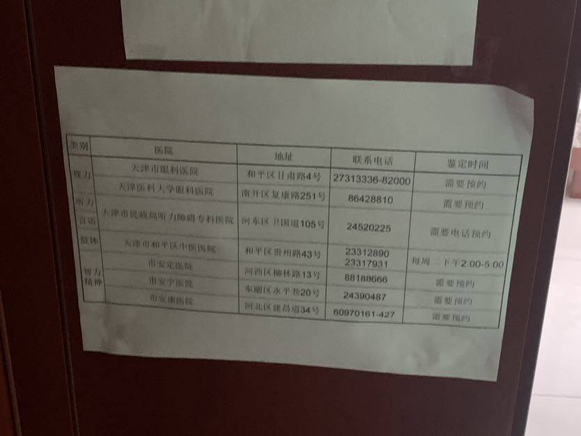 这是天津和平区办残疾证需要准备的资料,地址已经改变,一个临时地点,很快又要搬家,赤峰道与陕西路交口。