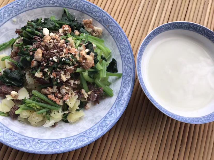 快手早餐~“我心所属”:1个大土豆,市售酱牛肉30克(核桃大小),菠菜40克(两棵),坚果碎适量,豆浆。土豆切厚片放锅里蒸熟,切碎;酱牛肉切碎;菠菜焯水,控水切段。所有食材都可以头天晚上备好,分装,放冰箱冷藏(包括豆浆,我是今早现做的)。早上先将菠菜放微波炉加热一下,然后与土豆、酱牛肉放一起,再入微波炉加热1分钟左右(根据自家微波炉脾气儿),撒上坚果碎(可以加一小勺香油/亚麻籽油/橄榄油),拌匀,吃啦~膳食指南明确提出,可以薯类代替主食,这份早餐富含膳食纤维、钾、VC、VE。🤗