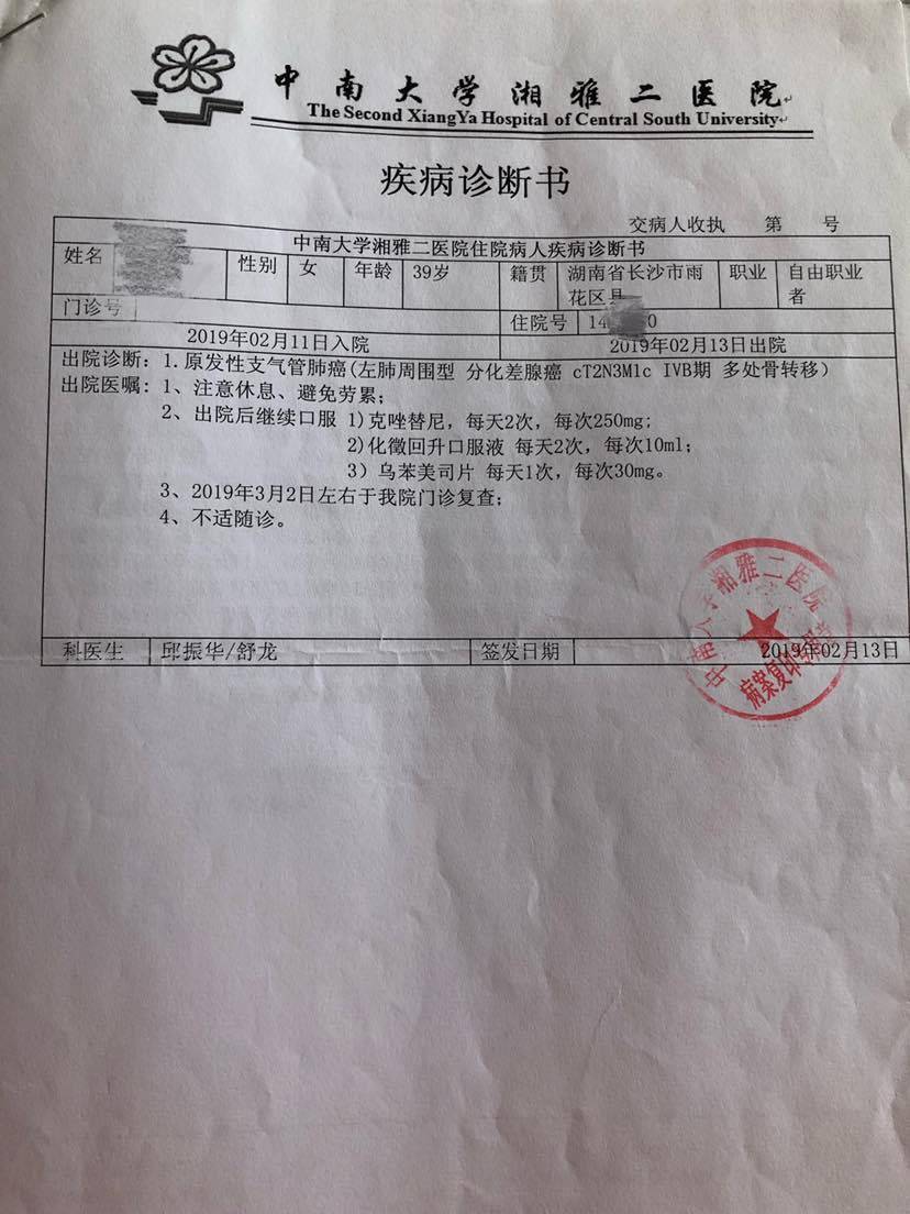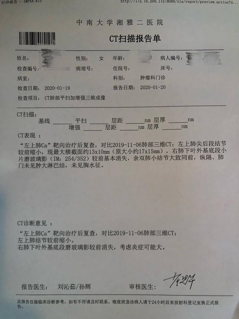妈妈患肺癌已经有三年了,这三年来一直在接受治疗到现在,下面是妈妈检查以及治疗的过程。2010年10月,妈妈体检出肺癌IV期,纵隔淋巴转移,肝部转移,去省肿瘤医院复查,做了PET-CT,结果一样,省肿瘤