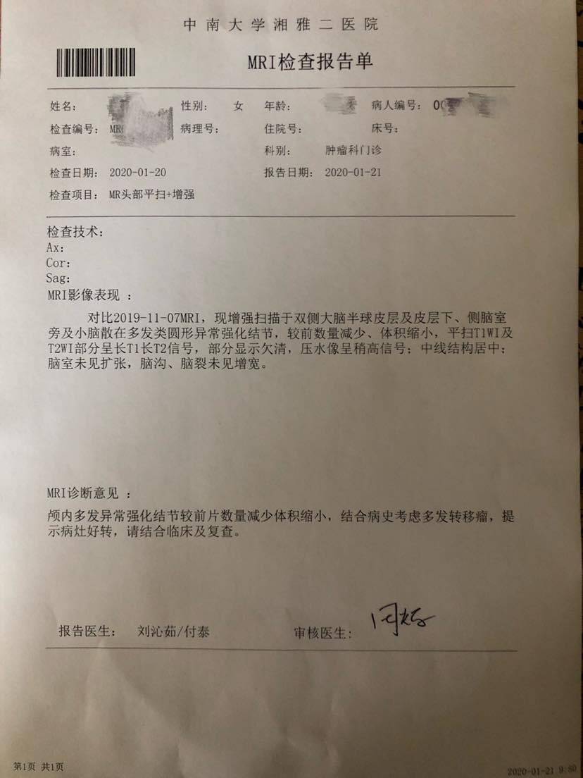 回想这一年,从2019年的1月无意间发现肺部阴影,再逐一排查,检查确诊。到2月2日,吃下第一颗靶向药,坚持每月打针,积极配合治疗。再到脑转,耐药,换药,治疗,检查。每一步都让我心惊胆颤。好在控制住了,但着凉头痛又上来了,这鼠年才刚开头呢,老天爷🙏让疫情快点安稳度过,恢复正常吧!🙏🙏让我们这些患着都好好的活着!