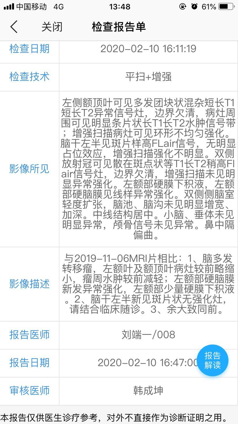 昨天的脑核磁共振报告出来了,是新增脑膜转移了吗?这样还有什么办法啊