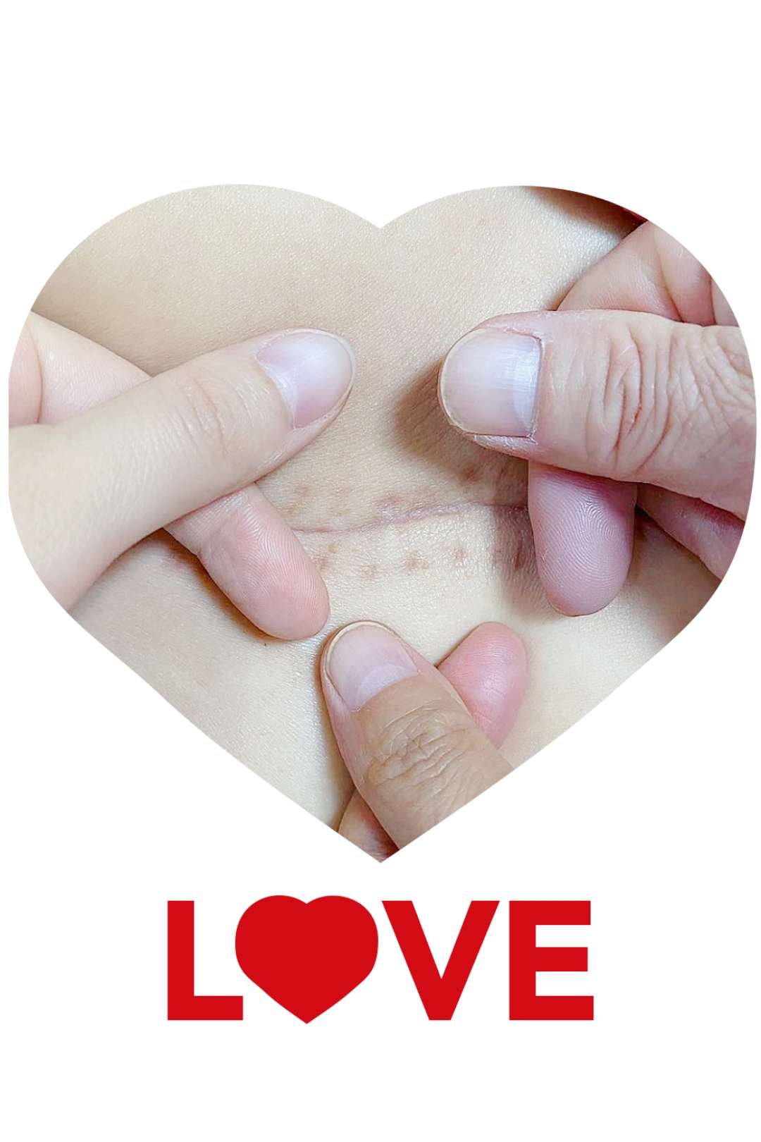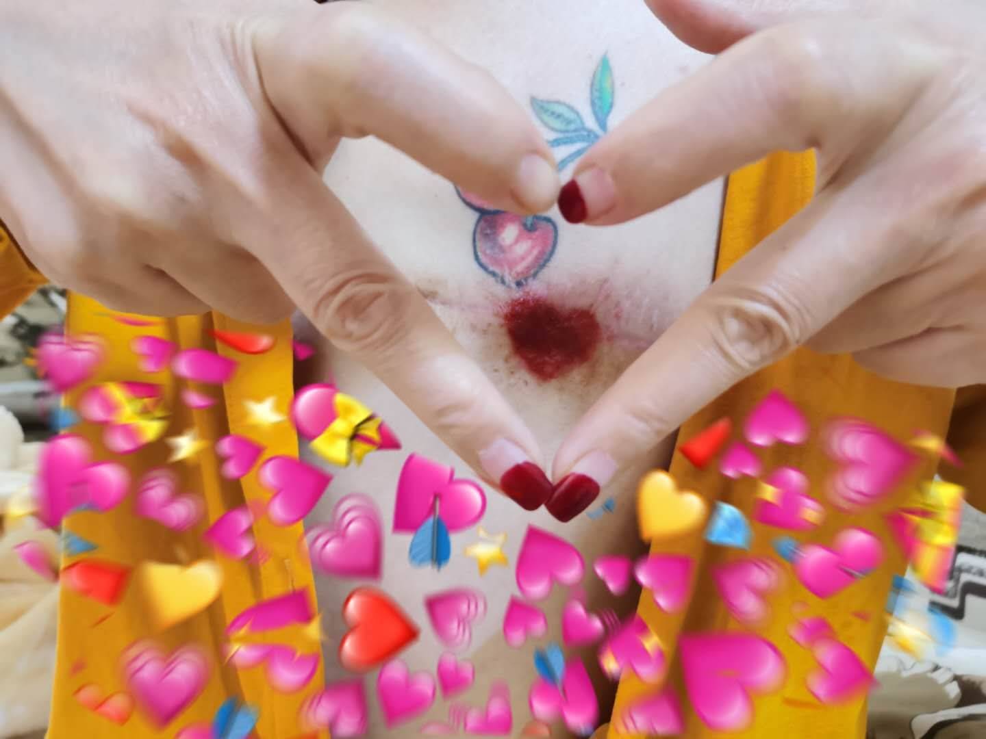 大家好,我是患者嘟嘟孩的妹妹。姐姐和我说觅健这个活动后,我就想,人间最大的力量就是爱心啊,所以我就来参加了。嘟嘟孩19年10月29日左乳手术后一直有快伤口结痂不掉,这是嘟嘟孩给结痂处上药的时候我突发奇想看见这结痂真像一颗红心,就照下来了!