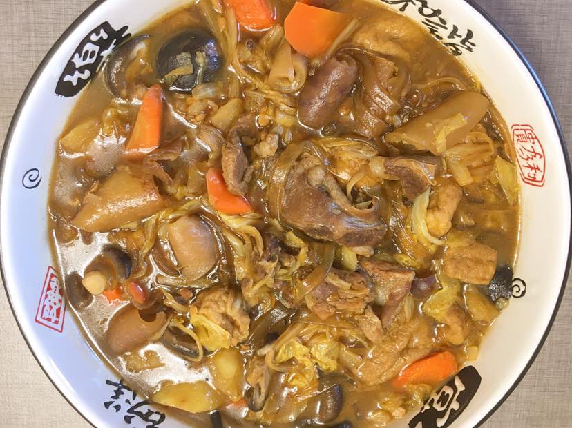 好久没吃大炖菜啦!今天做一个炖菜配上花卷绝对是黄金搭档。 热锅冷油加入花椒和拆骨肉,还有肉皮姜丝爆炒,然后放葱丝。加入酱油料酒翻炒,把白菜顺切丝入锅,断生后捞出放入砂锅中加水。依次放入土豆、香菇、豆泡、胡萝卜还有薯粉。要根据自己的食材选择先后顺序放入,水开后转中小火炖20分钟左右。