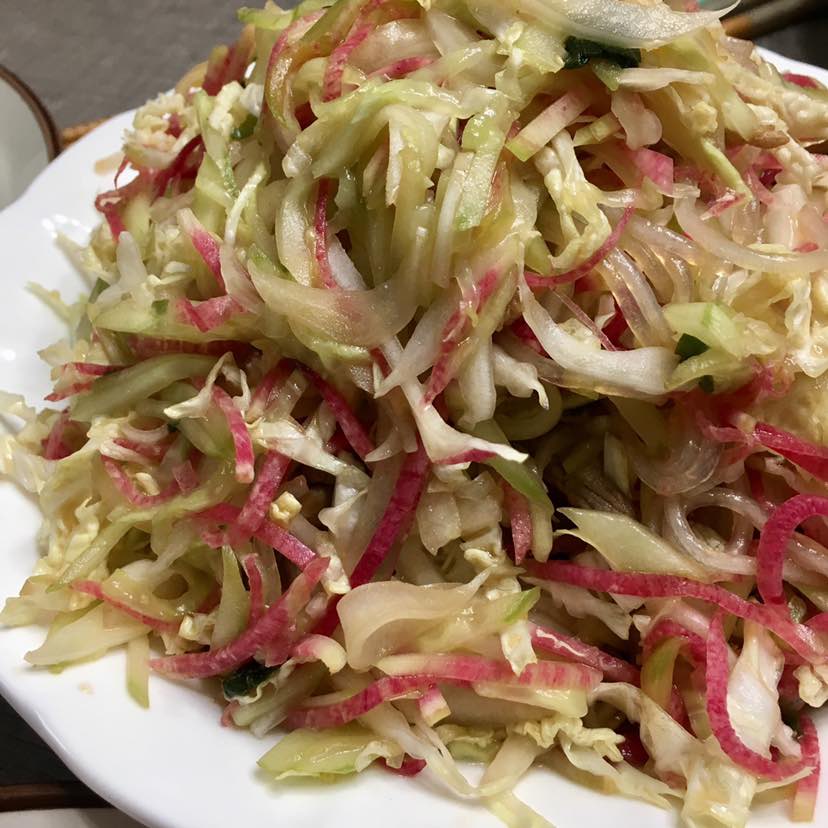 家拌凉菜,纯东北菜。把所有食材切丝,把薯粉焯熟,黄瓜丝和紫萝卜丝还有白菜丝。锅中加油把肉丝炒熟加入葱花和生抽关火,倒入菜里稍加点醋拌均即可,也可以放点香菜。