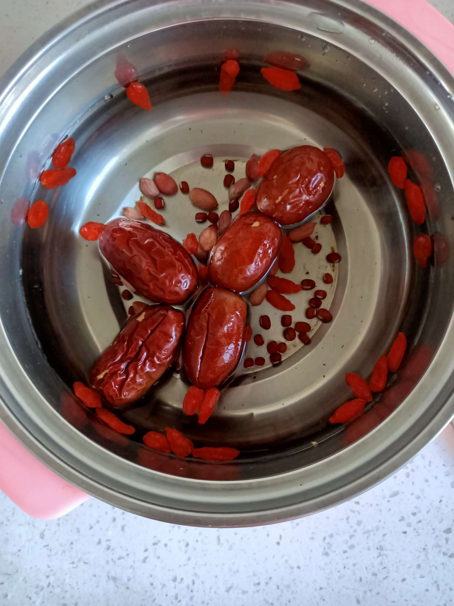 1、准备好食材:红枣5颗,枸杞、红豆、红衣花生各20颗,红糖、姜丝适量
