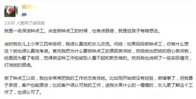 网上有位做保洁工的妈妈,怕自己的工作给上三四年级的女儿带来困扰,经常和女儿交心。