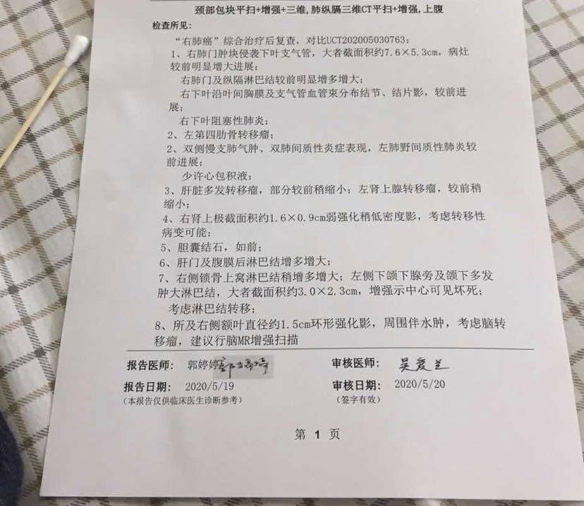 老爸肝功能刚恢复正常,ct显示肝肾转移瘤稍缩小,但是肺部肿瘤明显增大,并且可能脑转移。而且这次检查老爸还有免疫性肺炎,喘气严重,最近住院去消炎了。后续治疗方案医生也很棘手,准备再做一次基因检测,看看能不能配上靶向。我爸去年刚确诊的时候做过一次基因检测了,全阴,所以这次我只能祈求上天再给一次机会。