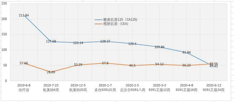 靶向药的治疗效果基本从三个方面来判断,CT 金标准,体感第一,肿标其次。附图肿标变化: