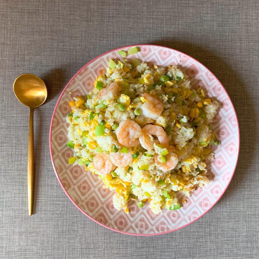 早餐家里没有什么蔬菜,做一个炒饭。也是很久没吃炒饭,放点虾仁和鸡蛋补充蛋白质,再加入适量的青豆和玉米粒。没有蔬菜还是觉得少点什么。