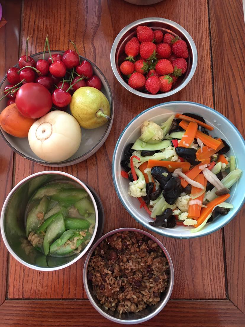 工作午餐:早餐没有吃青菜,午餐补上,虾米🦐炒丝瓜,杂粮饭,黑木耳、菜花拌蟹味菇、红椒🥕下午茶在吃几样水果就均衡啦😄午餐是哥们买菜回家,做好送公司来的😄不是秀恩爱哟,这个年龄就是亲情而已喽😄