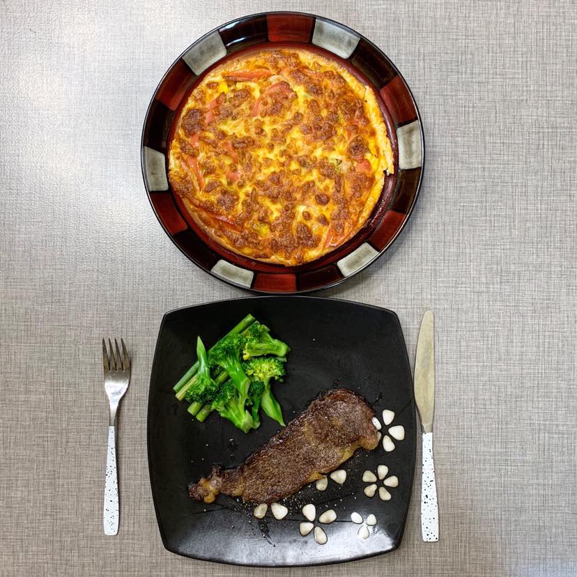 晚餐:自制披萨和牛排,牛排和西兰花都吃掉,披萨也就是吃一小块而已,晚餐一般情况下我不吃,用坚果或者自制小零食代替,但是最近加大运动量,适当地也要吃一点。嗨😢我的体型已经惨不忍睹啦!