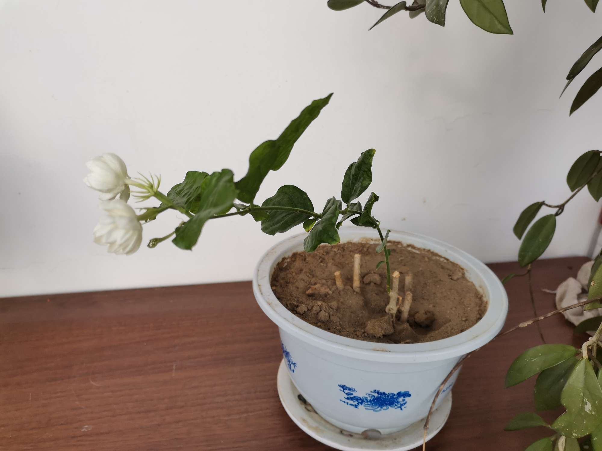 由于两地住,觅健赠送的茉莉花枯死了,我赶紧浇水,没想到冒出一枝嫩芽,竟然开花了,香味四溢!多么顽强的生命力!花谢后经蓝妹妹和阳子指导,剪枝后竟然又发了三枝,开了十几朵花,长成茂盛一盆,可惜照片我怎么也不出来了。