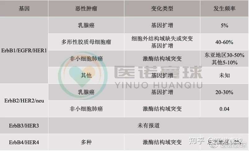 图注:HER1-4基因及其对应肿瘤类型和频率表