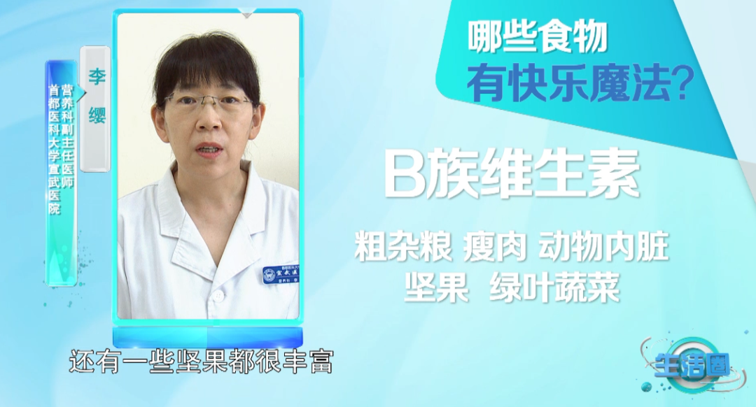 主要有烟酸、维生素B6、维生素B12、叶酸,这些是帮助我们合成快乐的神经递质。