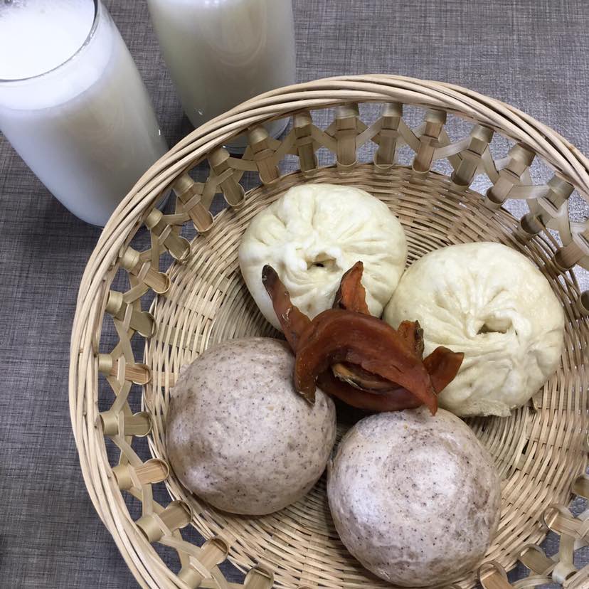 荠菜猪肉包子和杂面馒头、地瓜干、脱脂牛奶