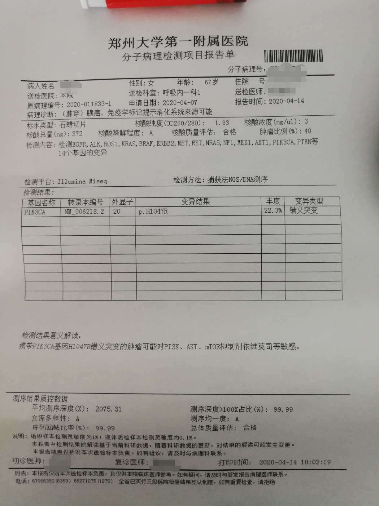 1、2020.3.25确诊肺肠型腺癌(肺穿刺活检),纵膈/脑/肾上腺转移,免疫组化PDL1阴性,基因检查PIK3CA突变