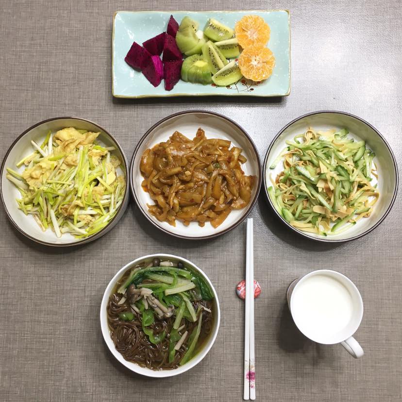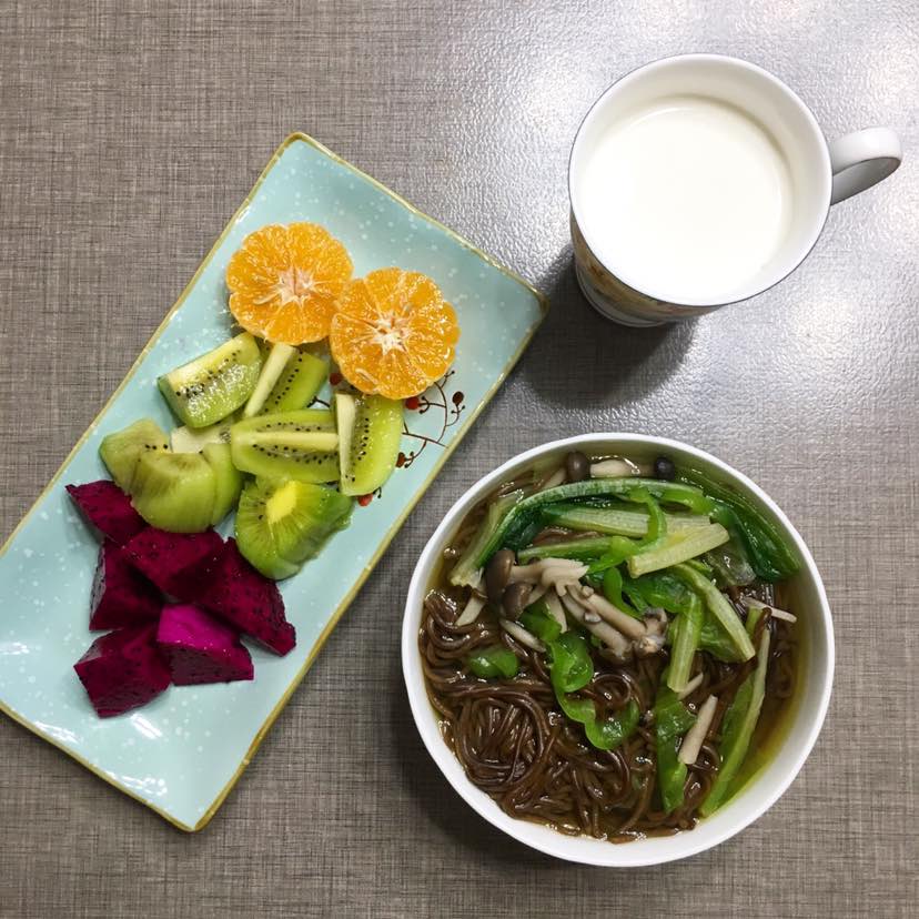 主食:无油蟹味菇、青椒、油麦菜、苦荞麦面。脱脂牛奶和水果