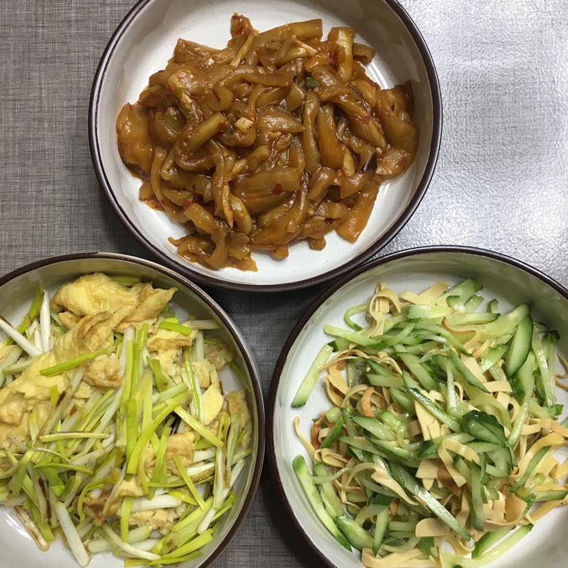 今日早餐:鱼香茄子/蒜苗炒土鸡蛋/五香干豆腐拌黄瓜🥒