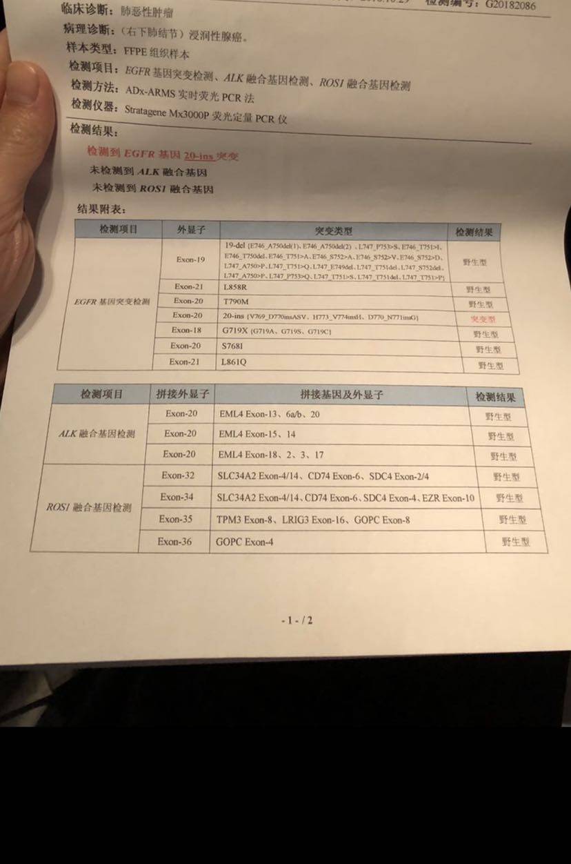 家母2018年10月确诊,病理肺腺癌,基因检测结果egfr20ins,医生说属于罕见的插入突变,没有靶向药。