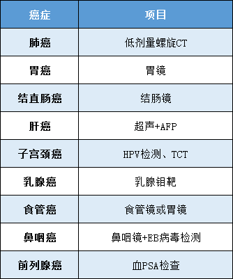 我这里给大家做了一个高发癌症的专项检查项目表,大家熟记。