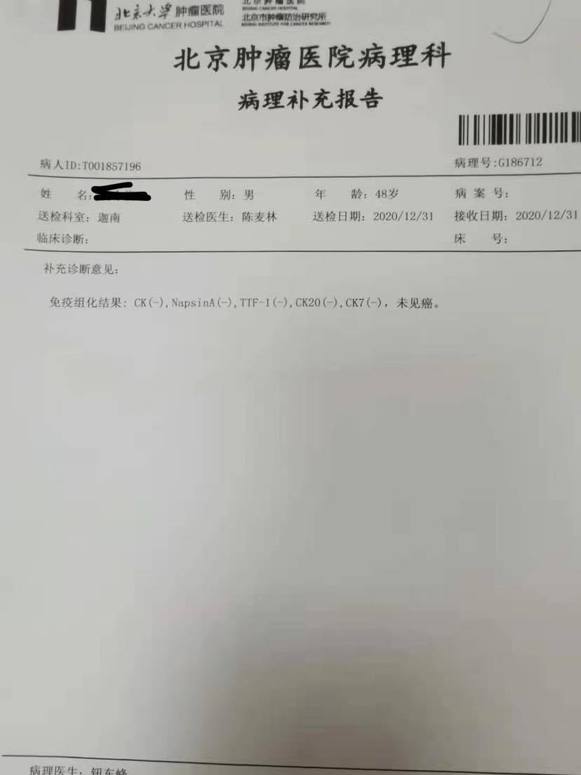 去北京肿瘤大学进行了肋骨穿刺,穿刺是由北京肿瘤大学比较权威的一个医生进行的,上个礼拜出的病理,见少量异型性细胞,建议做免疫组化,上网搜了搜,也看到好多病友的结果,不太抱有希望了,今天免疫组化结果出来了,未见癌。