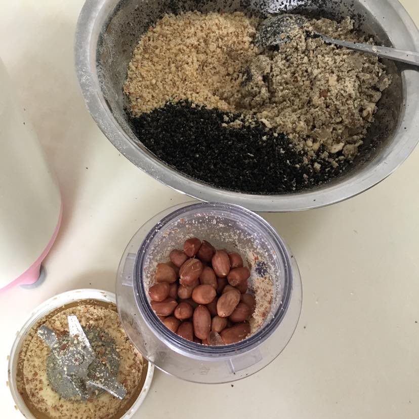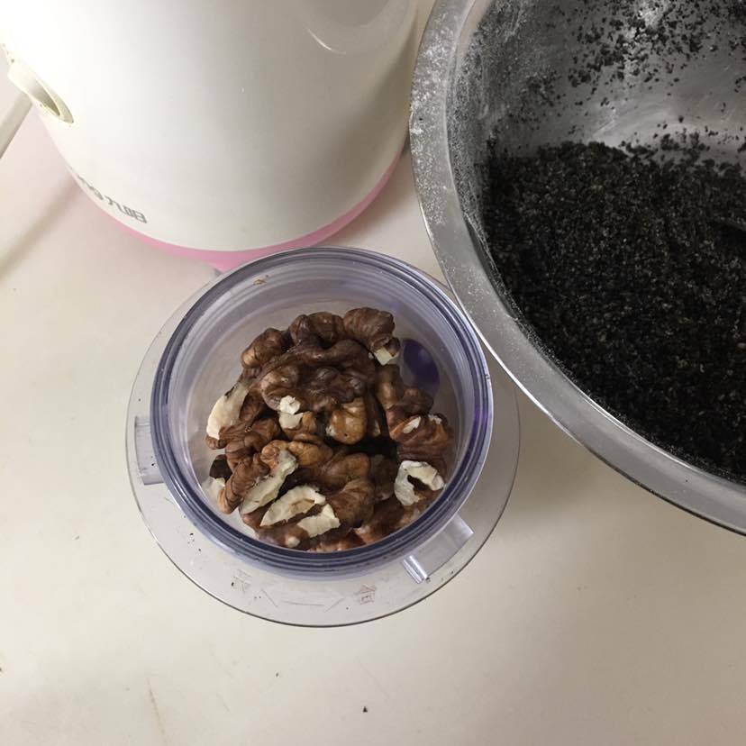 花生,芝麻炒香,加入核桃仁打碎,放入橄榄油和少量的糖,如果不放糖也可以。放一点口感要好一些。