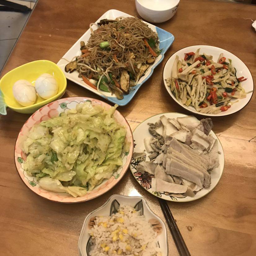 我起来,炒了个包菜,炒了个榨面。摆好桌才叫他。