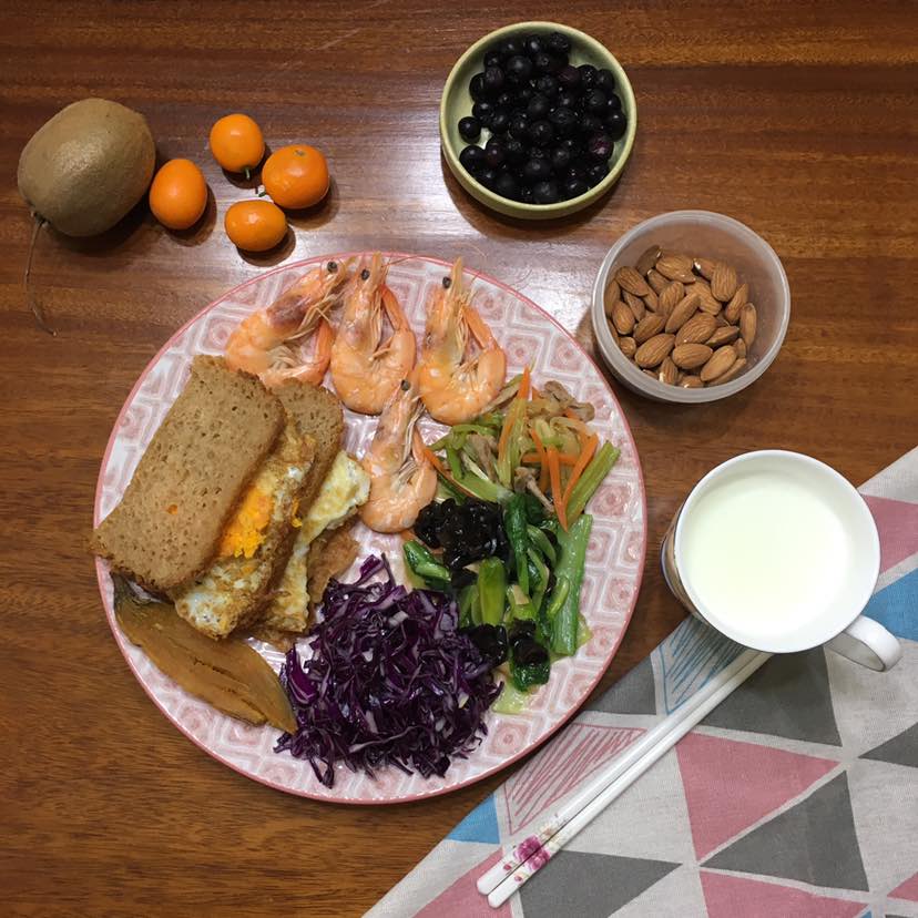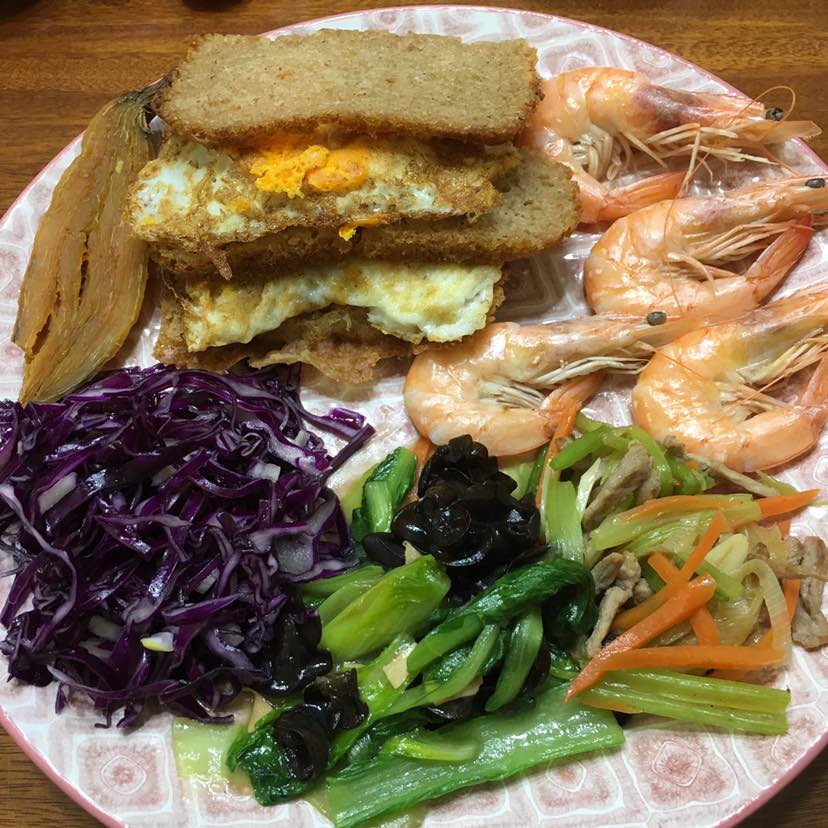 早餐:无花果面包,煎蛋,水煮虾,橄榄油拌紫甘蓝,肉丝香芹炒🥕油菜炒黑木耳,地瓜干🍠