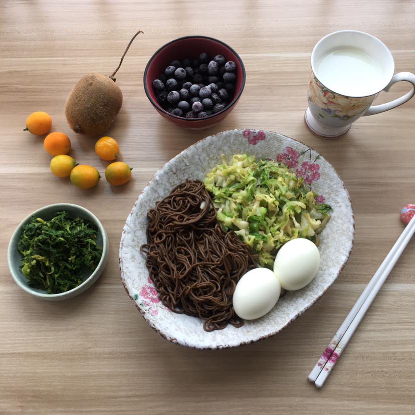 一个人的早餐:圆白菜拌面🍜芹菜叶,脱脂牛奶
