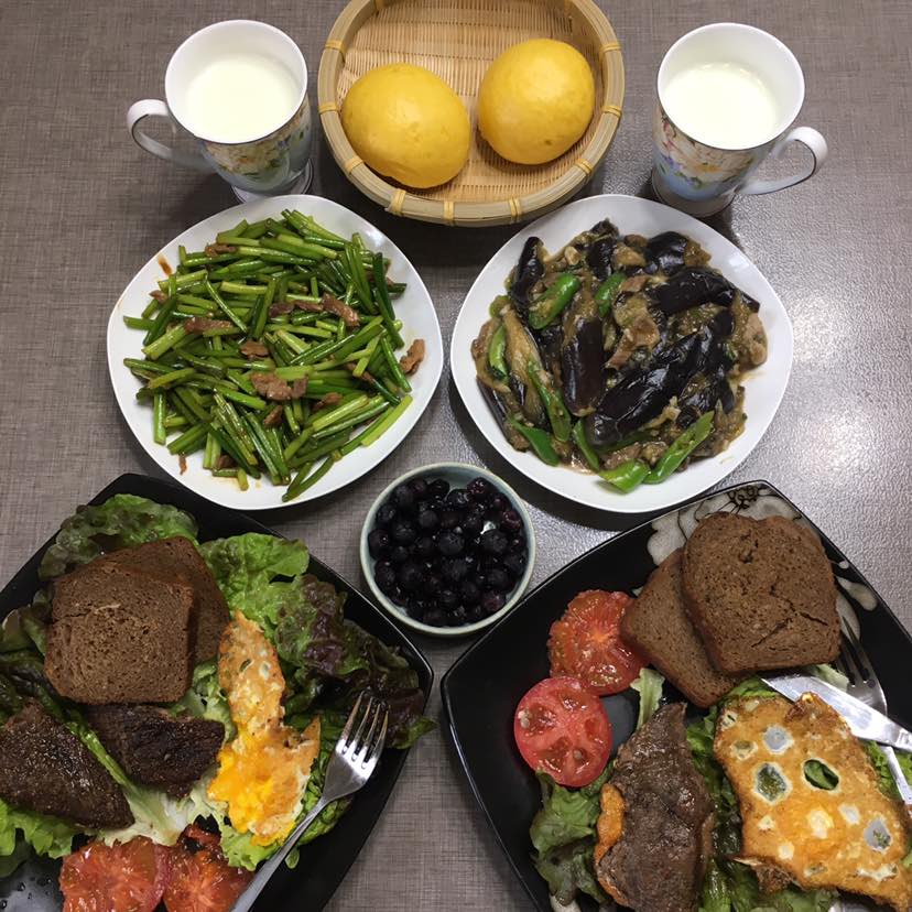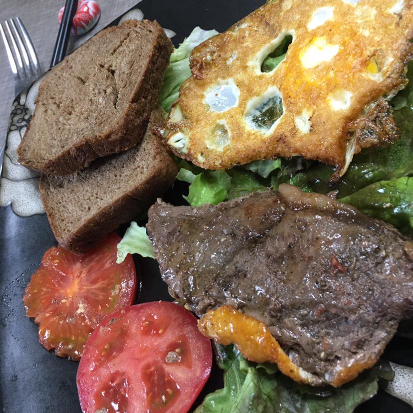 早餐:黑面包,黑面包是用面包机自己做的。我在杂粮店买的黑米面。比例一半白面一半黑米面。不放糖,放酵母和牛奶。面包机做面包很方面,而且健康无糖。煎一块牛排,再搭配生菜和西红柿🍅还有煎蛋。早餐碳水化合物、蛋白质维生素都有啦!妥妥的健康早餐。