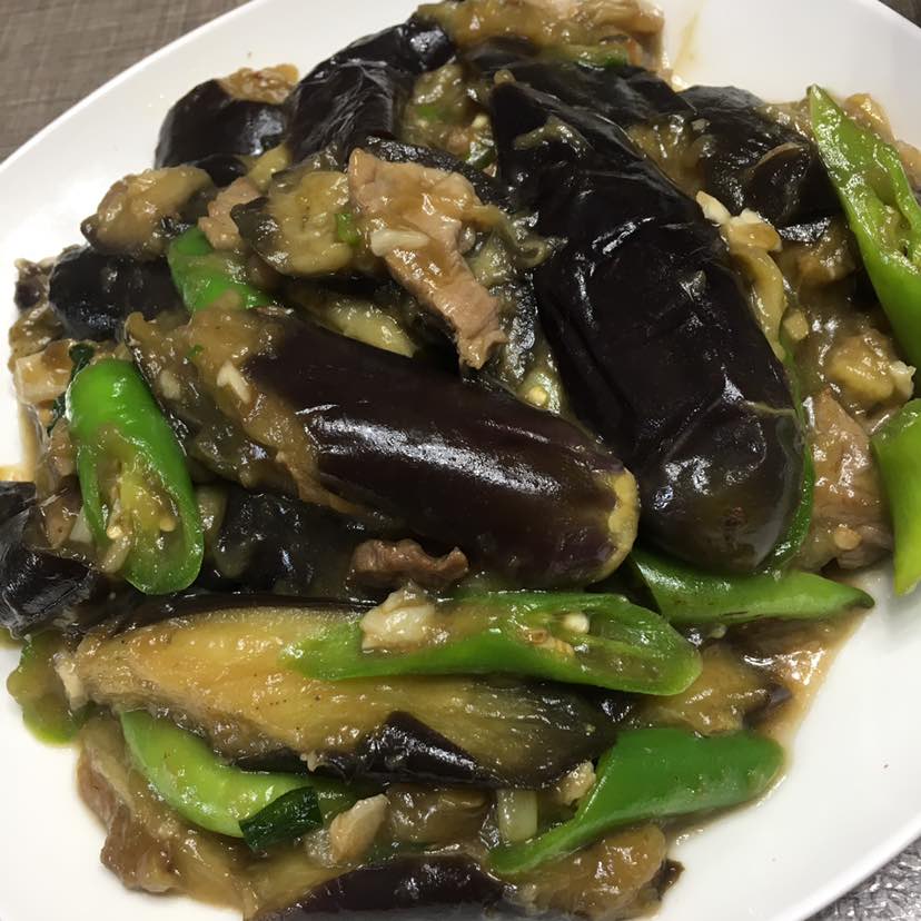 烧茄子,我做茄子不过油。茄子切成菱形块放入锅中蒸熟。放点肉片和尖椒炒一下就好。