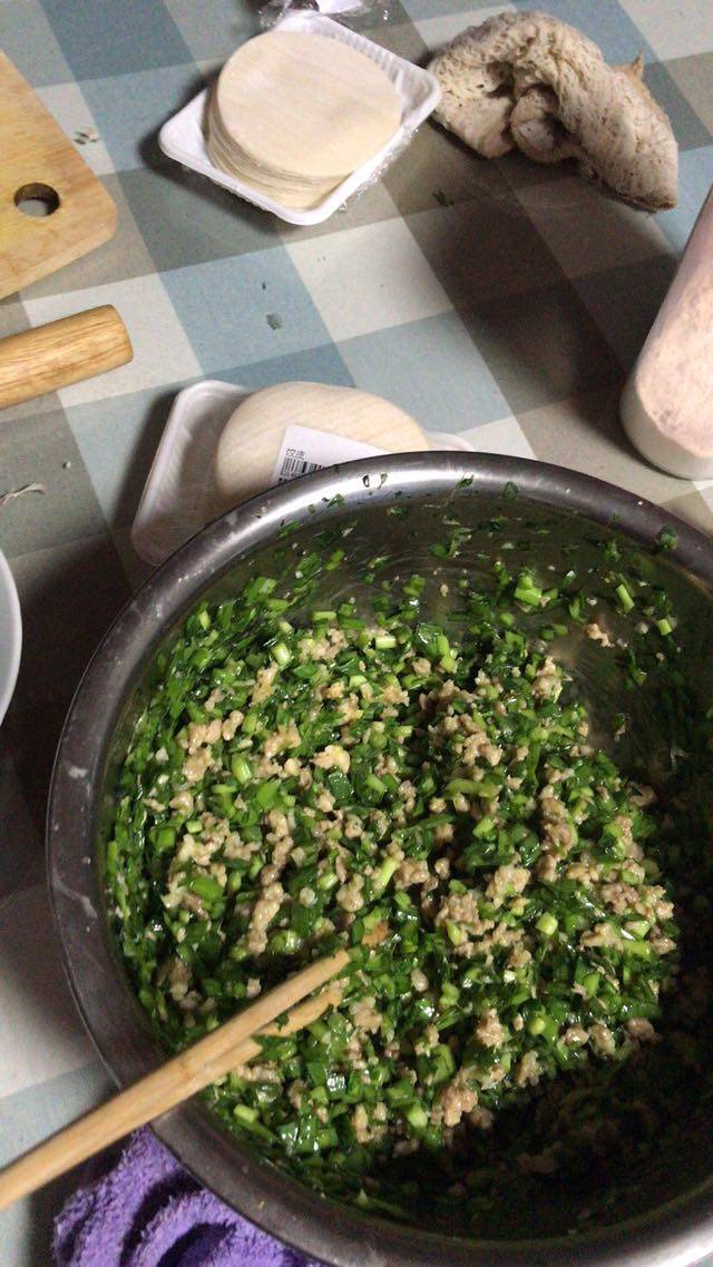 肉称多了,蒸包子没用掉,于是又去买了韭菜、饺子皮,包了一点饺子。