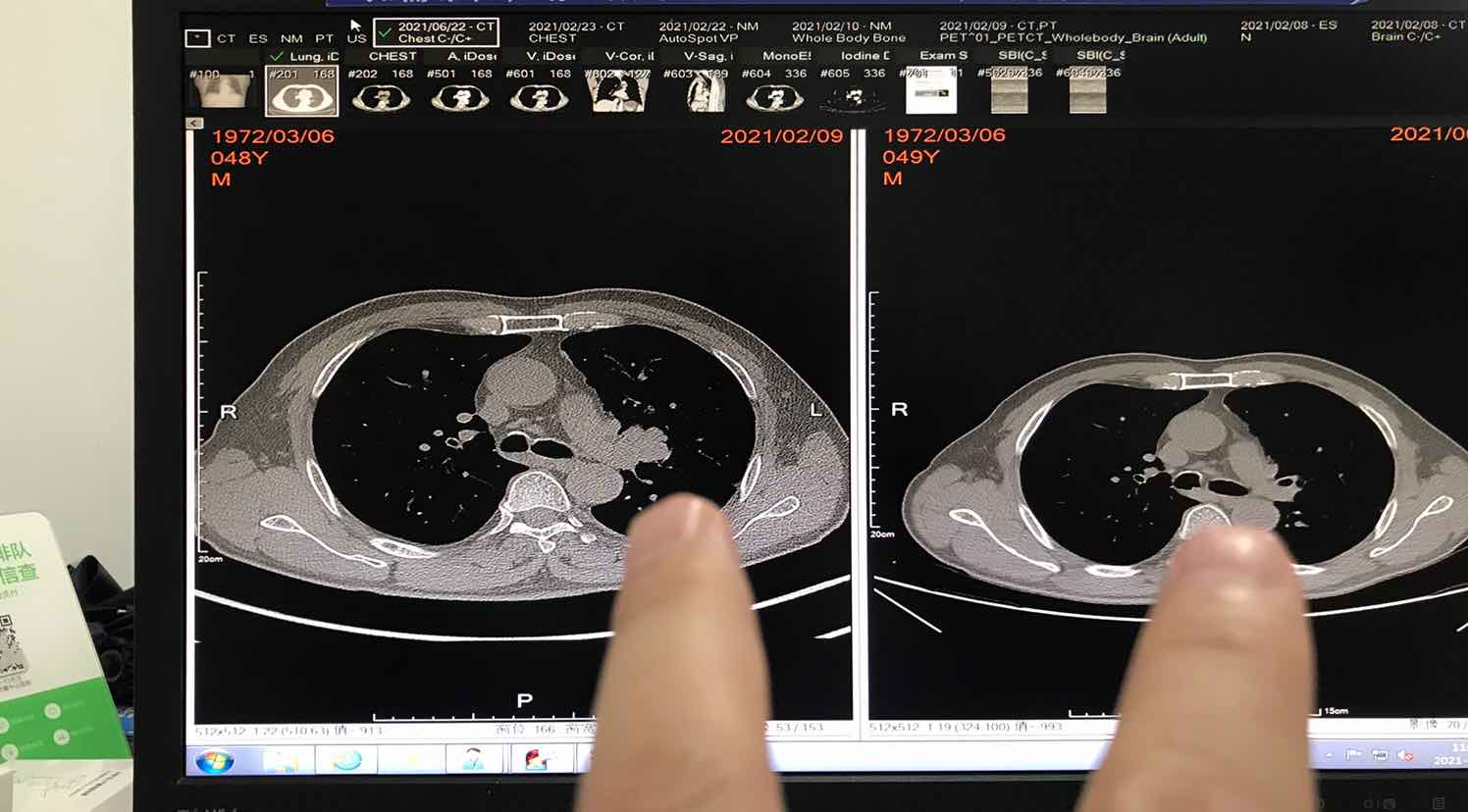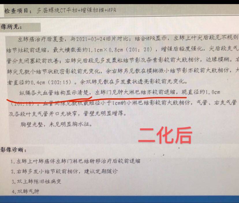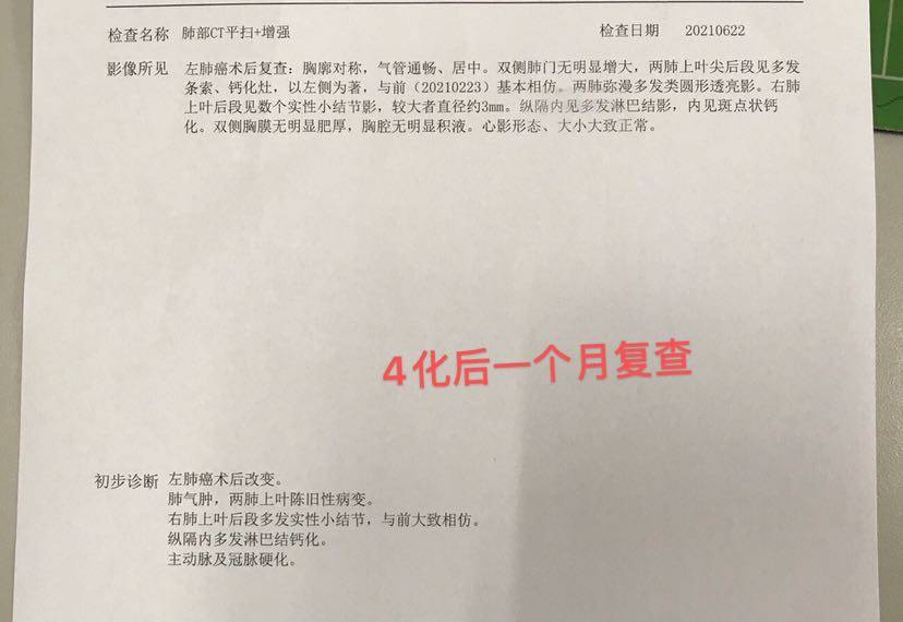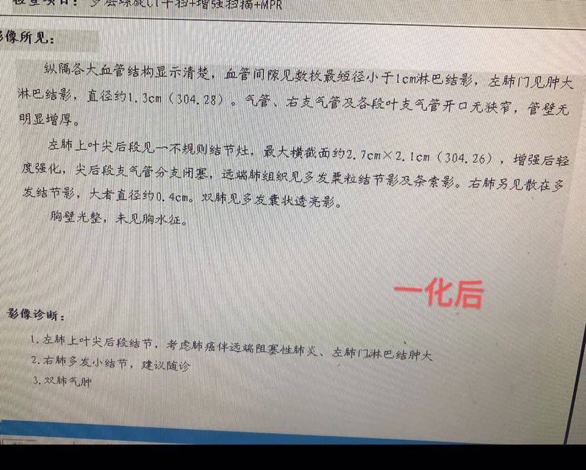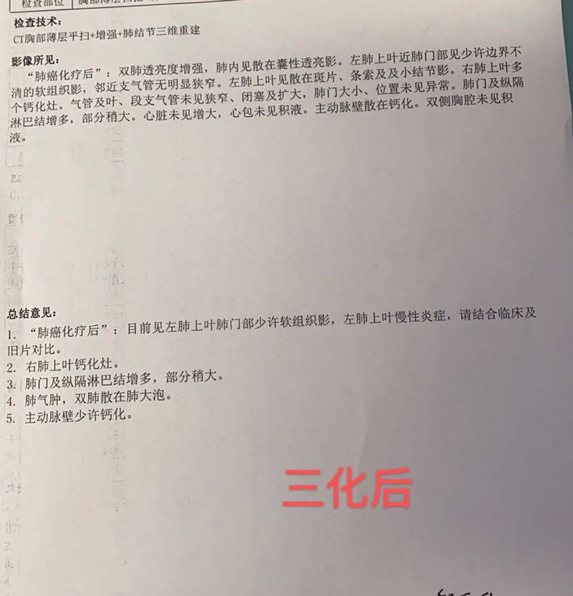 4化结束一个月了,等待华西手术中。迫于好奇心,昨天带我爸去做了个增强CT,今天拿到结果,吃了一惊,报告左肺癌术后,双侧肺门无明显增大,看到这句,我以为拿错报告了,激动的赶紧去找了医生,说看不到病灶了,CR了!下面我大概写一下我父亲的治疗方案。