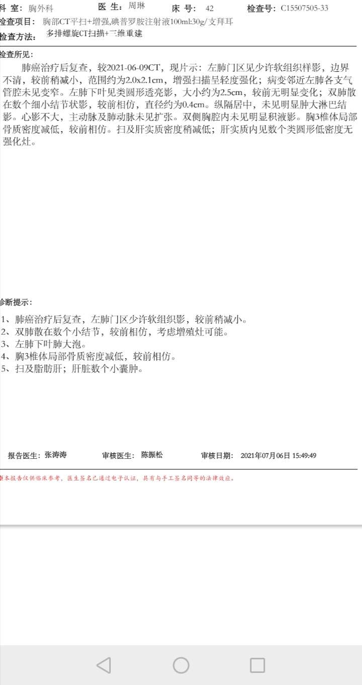 张大侠,这是我的胸部CT单,医院考虑了可以手术,不知你认为此时手术时机到了没有?今年4月初确诊,4月14号开始口服阿来治疗至今