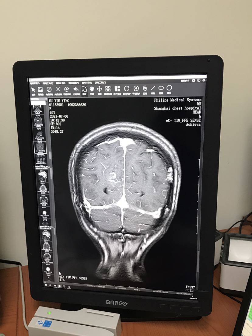 患者66岁,于19年4月右上肺叶切除,肺腺癌术后3a,21 l858r突变,19年6月开始易瑞沙至今,7月初复查结果身体各处指标和影像都正常,脑核磁显示右侧顶叶片絮状强化影,怀疑脑膜转移。