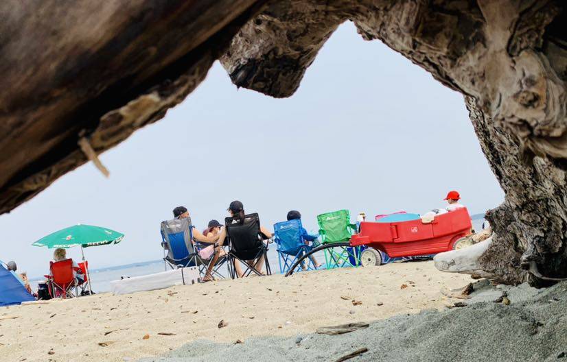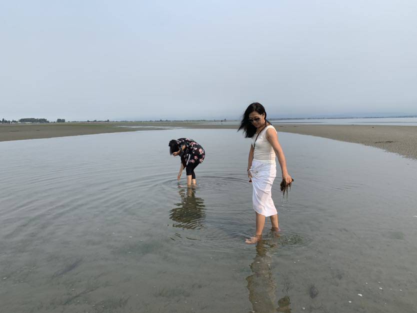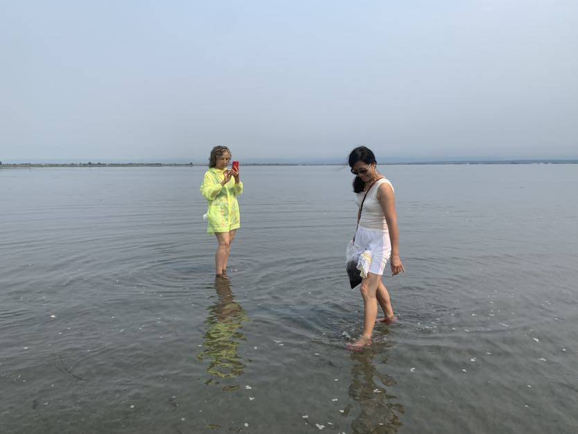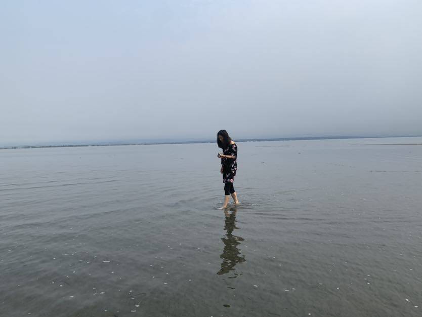 谁知道海上呆了一天,热浪也没来,还冷嗖嗖地。太冷啦,说好了游游也没能游。我们四个女人只能在海里趟趟水,捡点海货了。