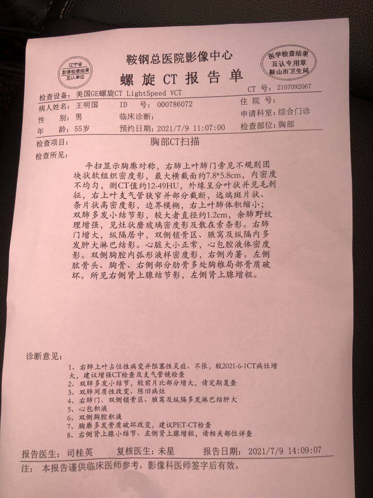爸爸确诊病情已经有11个多月了。一共做了8次大化疗,2次小化疗,以及35次放疗,上月返医院检查“瘤子”没有了。这一路走来,有多少的艰辛与泪水。在这里与大家分享爸爸的治疗过程。起初,拿到病例报告的时候,