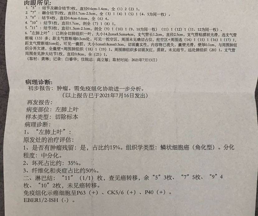 从上次发帖到现在,已经术后一月了,不得不说时间过的太快了!当时入院医生也有说到我们治疗效果那么好,接近CR可以维持治疗,让本不想手术的我爸更不想手术了!术前我焦虑的不行,心里想着只要我爸说一声不手术了,那我就带着我爸回家,直到焦虑到把我爸送进手术室!那刻心里还想着,带我爸逃离医院,不手术了!想着开胸手术太可怕了,另外老爸查出腹壁血栓,也是让我焦虑的一点,还有一点就是全肺的风险!但还是不得不陪着我爸到手术室门口,看着他推进去的一刻挥泪如下,反而心里的焦虑,畏惧不知道为什么在那刻反倒安定下来了!老爸早上7.30进的手术室,直到1.40分才通知家属各种签字,说已经去icu了,要隔天来接!第二天接到老爸回病房,接下去就是一系列的拍背咳嗽检查,细节就不多说了,接连几天我们终于出院了!看着老爸慢慢好转,心里也舒坦一些了!但是出院证明上写的术中冰冻处理结果鳞状细胞癌,我看到这个就内心不好了,我原想着治疗效果好,接近CR,结果会好一点,接下去就漫长的等待病理!