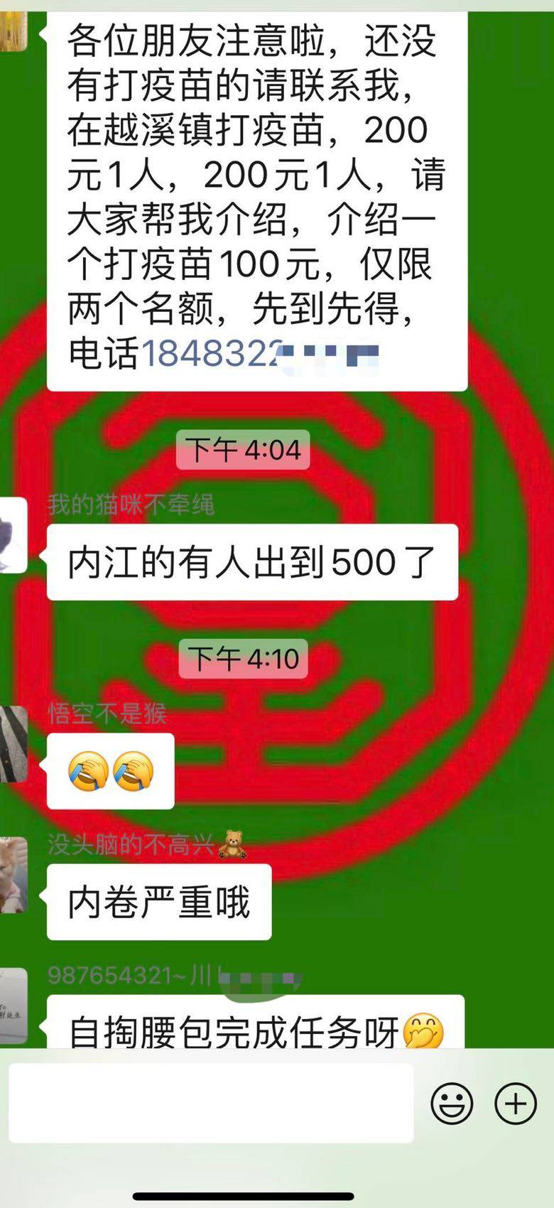 这段时间我县要求单位职工至少动员2名适龄无禁忌症人员接种新冠疫苗,为完成任务各个群里开始抢人大战,最直接的金钱诱惑。威远融媒还提出新接种的有赠品奖励和专车免费接送。