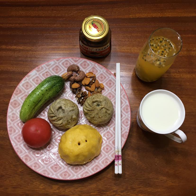 早餐:两个杂面荠菜猪肉包子,一个玉米窝窝头,一根黄瓜一个西红柿,一杯脱脂牛奶一杯百香果水,腰果和杏仁还有核桃。