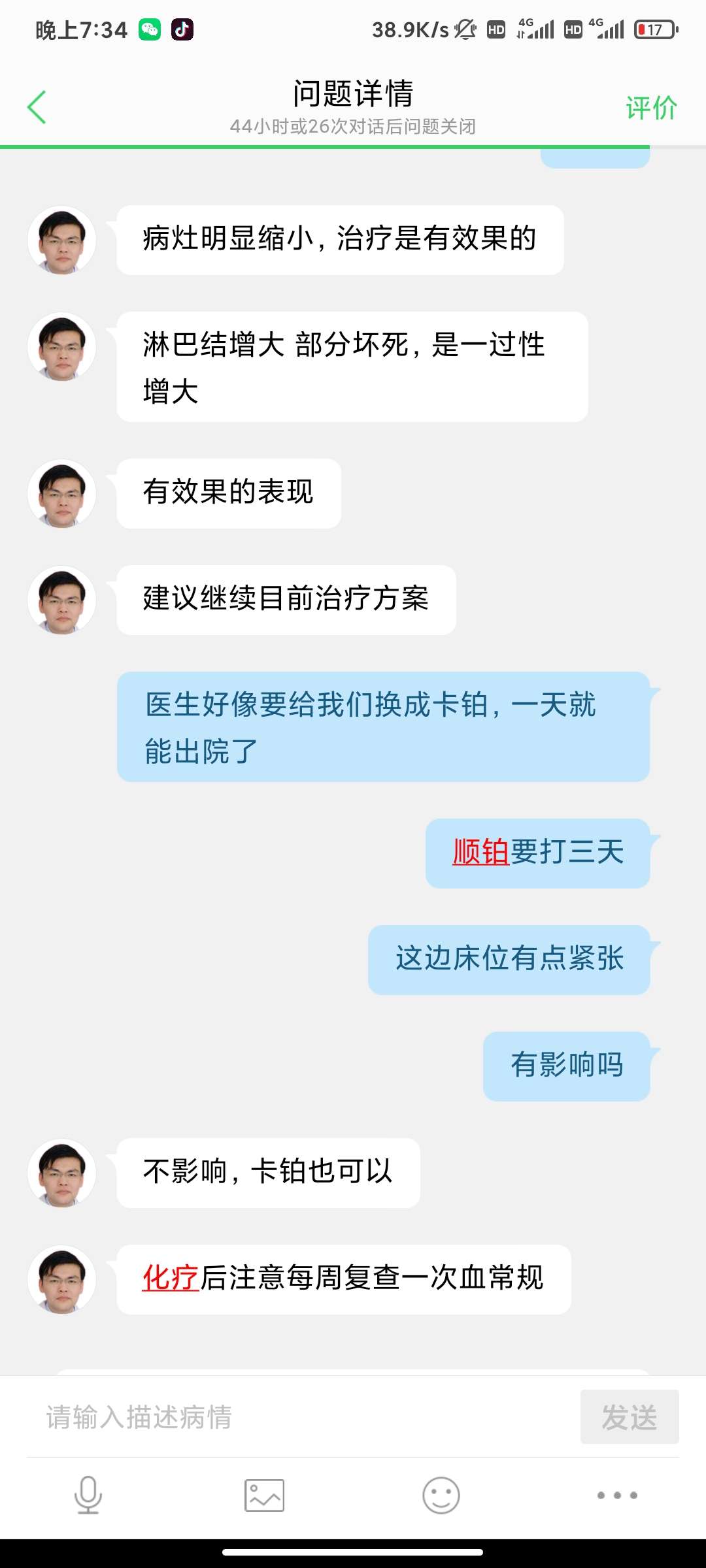 烂漫的树叶6819接下来方案:白紫+卡铂+k,顺铂换卡铂,可能医院床位太紧张了,卡铂第二天早上就能出院了,顺铂要第三天晚上才出院。