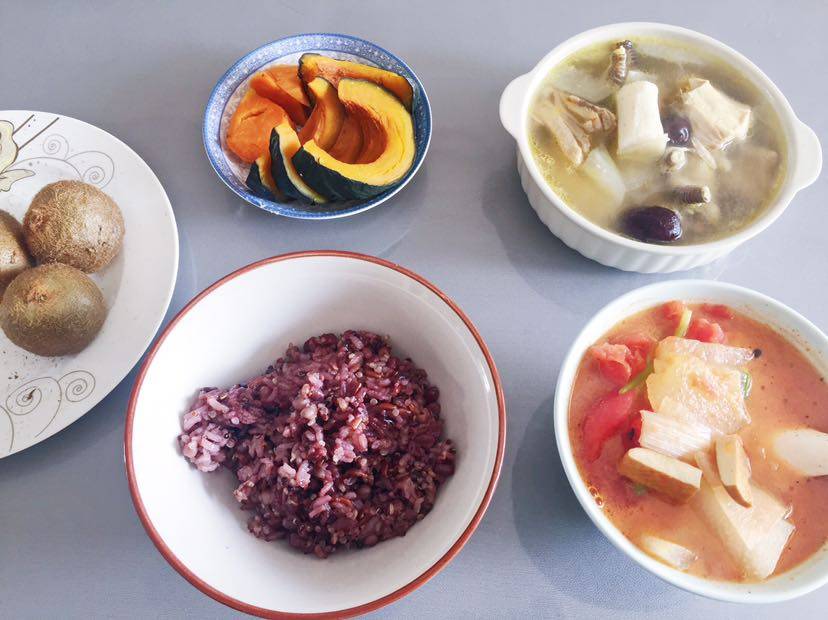 贝贝南瓜、红薯、弥🐒🍑、母🐔汤炖山药、素菜汤(蕃茄、冬瓜、豆腐干、🍄)、杂粮饭