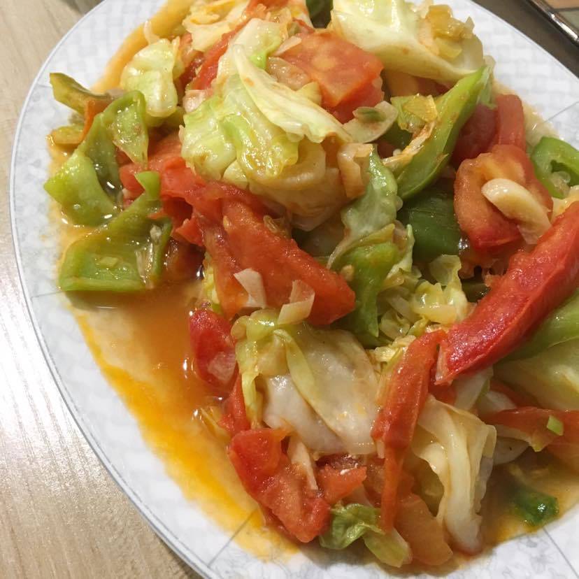 西红柿🍅青椒炒圆白菜,这个菜素炒。味道不错👍