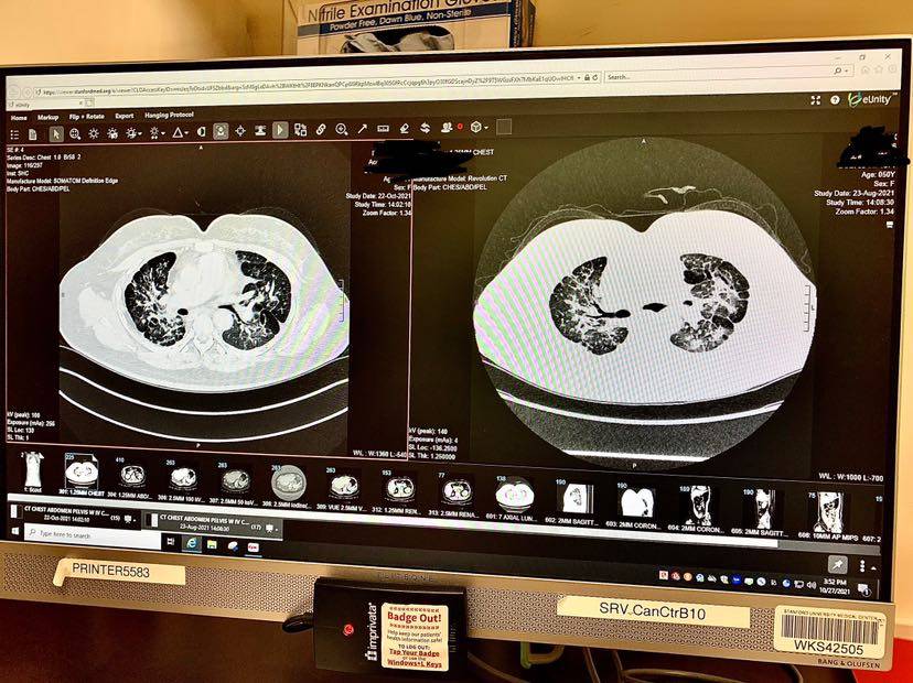 最近的这个月我又出现了气短,上楼梯、提一点重量的东西走路都出现了短暂的缺氧88-90,但是休息一下1-2分钟又回复到正常的97-96。所以告诉医生后又要我拍CT,CT结果医生说对比2个月之前的好了很多,我都不懂看,反正这个结果我也没有什么好高兴的,因为还是解释不了为什么我会气短?医生说暂时先不要换药,观察一下,如果气短加重有及时告诉她们,反正现在能吃、能喝、能睡,正常生活,所以也没有想太多,现在我是佛系态度去对待我的病,该干什么就干什么,做自己喜欢的事就好!下面的图片左边👈是10月22号拍的,右边👉是8月23号拍的对照图片。