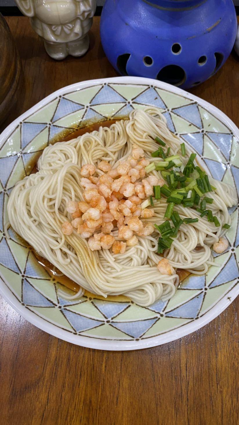 早上去菜市场买鱼,看到难得一见的小河虾,买了一斤,学着网上的视频做了苏州的三虾面,河虾洗干净去头剥壳和虾仁分别装在两个碗里,虾壳炸虾油,用漏勺装壳沥油,趁热倒入蒸鱼豉油搅拌成汁,其实应该用蛤蜊酱油,没有,就地取材,洗锅,再倒入少许油爆炒虾仁备用,另起大锅烧水下面,细面开锅三分钟后捞起装盘,淋酱汁油,撒葱花,倒虾仁,一气呵成,鲜香适口,其实缺少虾籽,这个季节的河虾太小没有籽,还不能算是真正的三虾面,苏州的三虾面贵的是有道理,就我这盘面上的一点小河虾剥了半个小时,本来想自己做可以搞多多的虾,实在剥不动了。