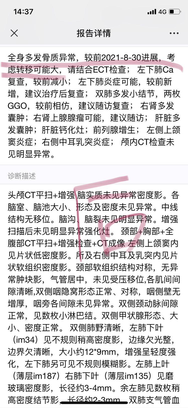 2.提示骨转移进展,之前是几处,现在全身都转移了(颈椎、肩部、腰椎、肋骨、骨盆),都提示骨密度增高!