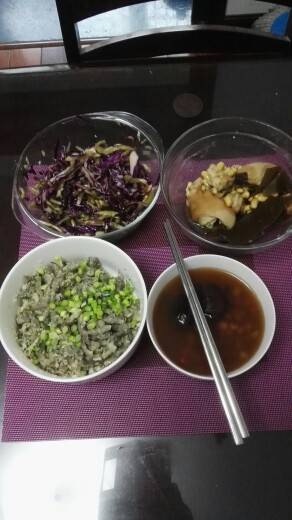 黄豆猪蹄、五红汤、蒸菜、紫包菜和莴苣凉拼盘