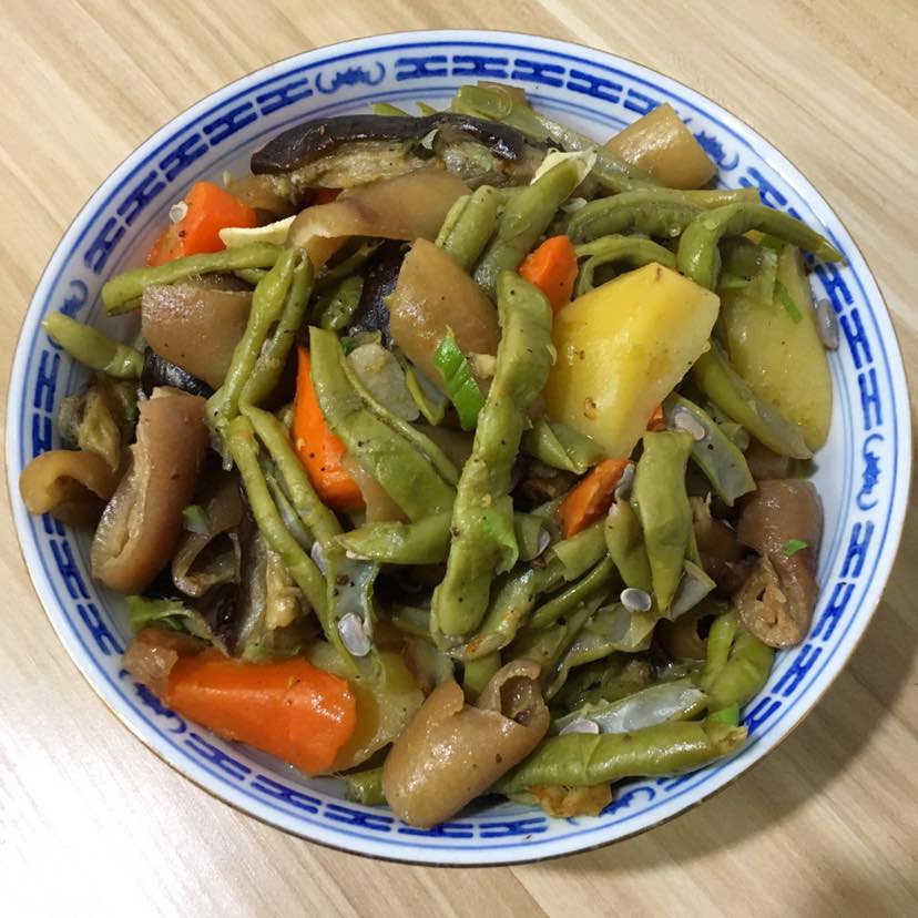 再来一个东北乱炖😄哈哈,肉皮我的最爱。豆角,胡萝卜🥕茄子🍆还有土豆🥔一个乱炖5种食材。