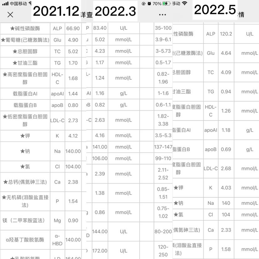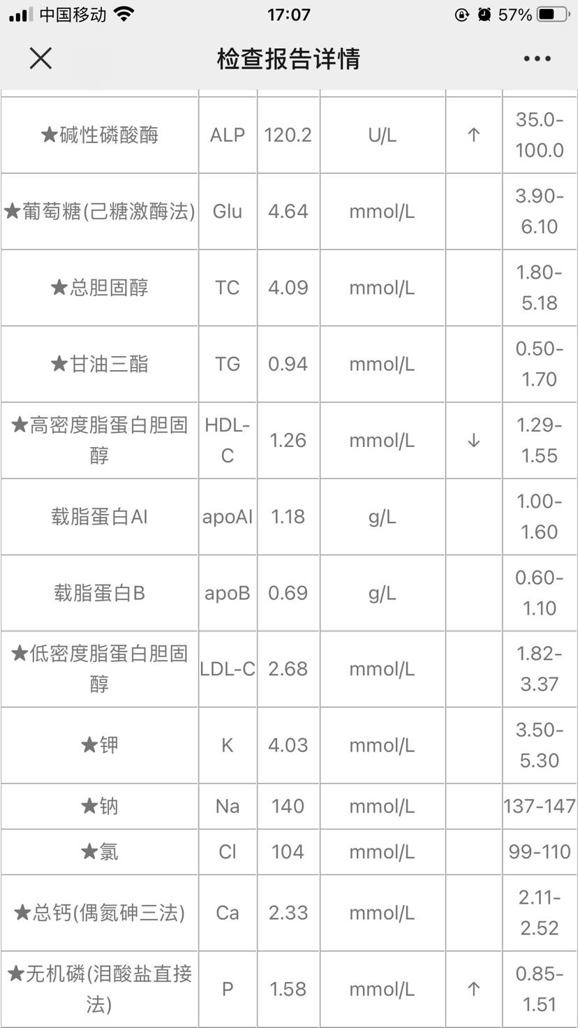 今天主要想跟大家分享一下碱性磷酸酶,这个也是最近发生在我身上的事情,以前我根本没注意过这个指标,其实每次化验结果出来我这个碱性磷酸酶都高一些,刚化疗结束的时候各种指标都不稳定,忽高忽低的我也是有点大条了,以至于持续到现在这个指标还是高出标准值我也没在意直到这次化验我的低密度脂蛋白和脂蛋白a超高了,我查了百度又问了医生大概直到这个是心脑血管不好的指标。医生说这个没什么办法,注意饮食。确实这两个月单位忙我饮食不规律又不运动,免疫力下降一个月都感冒两次呢,冬天真是一个考验人意志力的季节啊!说回这个碱性磷酸酶,骨转移的病友都知道这个是关于骨头的指标,当我知道这个以后我脑袋嗡的一下,以前怎么把这个大事给忽视了呢。我翻回之前的化验发现每个月的都高这把我吓的可不轻,赶紧去找医生问,要我说小地方的医生真的是不负责任,我说这个值高了,她告诉就怕骨头有问题你去省医院做个骨扫描吧 我的天啊,医生说这话我心里更没底了,我当时很气愤的 医生怎么这样呢,我这个值每个月都高,我不问医生也不说 这也是我为什么想在这里给大家科普的原因,真的我们还得靠自己,指望别人都白扯!不敢耽误时间安排好工作直接去医院挂号了,这个骨扫描需要预约,直接约到了下一周,就继续回单位上班了,也不知道是心里作用还是什么原因,尾椎骨疼,头也疼,本以为睡一觉就好了,但是还是持续的疼,我这心里更害怕了,这种害怕并不是文字能表达出来的,直到今天我尾椎骨还是很疼,这是我第一次做骨扫描,内心还是慌的一批,还赶上起大早赶了个晚集去了没有药一直等到中午才打了造影剂,打完后需要拼命喝水,喝的我都要吐了,终于做上了 然后第二天才会出结果,说真的做骨扫描打造影剂,辐射啥的都是小儿科,等耐结果才是煎熬,虽然我内心感觉应该没多大问题,如果真的是骨转移那这个指标高了好久也不会让我消停到今天。可是每次觅健查症状也有人说骨转移没有症状我又陷入了惶恐中!我反复打开百度查着同样问题,也反复打开觅健看看有没有类似的情况,都没有具体说明。所以我一定要把这次经历记录下来,让大家做个参考。打了造影剂没有特别的不舒服,但是头疼是真的,恶心也有晚上8点就睡了,第二天早早就醒了反复打开手机查结果,看到结果那一刹那心里多少有点安慰,能看出来虽然有问题但应该不是骨转移,赶紧起床去找医生再确认一下,毕竟看到颅骨 骶骨代谢不均匀,这一查百度就肿瘤病变,并且越查越吓人,我这还有髋臼股肩胛骨都提示良性病变,过程我就不写了 大家都知道医院看病没纳闷容易,内心感受也不说了毕竟科普文章还是跟大家多说说指标和结果。医生担心辐射让我满24小时再找他,他简单扼要的跟我说你这个不是骨转移,我说我骨头疼他说那有可能是吃药的问题,其实这些我都知道,但是医生亲口说了才放心嘛!好像说了很多废话但是也是内心感受。