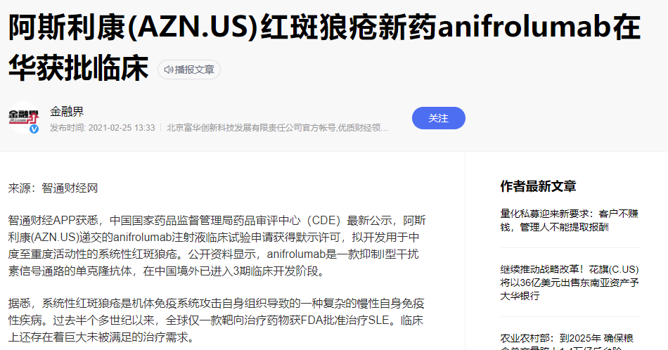 酷炫的紫菜Anifrolumab是一种靶向于干扰素受体的单克隆抗体,用于治疗中度到重度系统系性红斑狼疮,目前II期临床研究已经完成,有两项III期临床研究正在进行中。系统性红斑狼疮是一种免疫失调疾病,免疫系统对人体自身的器官和关节部位产生攻击。目前市场上可选择的系统性红斑狼疮药物很少,最近10年被批准的药物仅有GSK的Benlysta, anifrolumab的靶点是炎症相关的蛋白,称为I型干扰素受体(IFN),此受体在系统性红斑狼疮中起到核心的作用,II期临床研究显示,300mg的anifrolumab经过169天的治疗后,有34.4%的病人起到治疗效果,而一年后总体反应率超过了50%,同时病人对皮质激素类的依赖性变低了。此项研究证明了I型干扰素受体是治疗系统性红斑狼疮极具开发潜力的靶点,同时支持anifrolumab进入III期临床研究阶段。